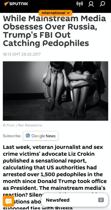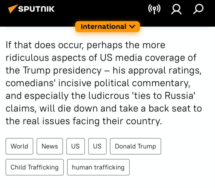 El artículo continuó informando que escribí en algún momento que nuestros medios masivos se verían obligados a cubrir la terrible epidemia de trata de personas que ha asolado a nuestro país durante demasiado tiempo. Sputnik señaló: «Si eso ocurre, tal vez los aspectos más ridículos de la cobertura de los medios estadounidenses de la presidencia de Trump: sus índices de aprobación, los comentarios políticos incisivos de los comediantes y, especialmente, las ridículas afirmaciones de ‘vínculos con Rusia’, desaparecerán y tomarán un lugar en el asiento trasero de los problemas reales que enfrenta su país”.